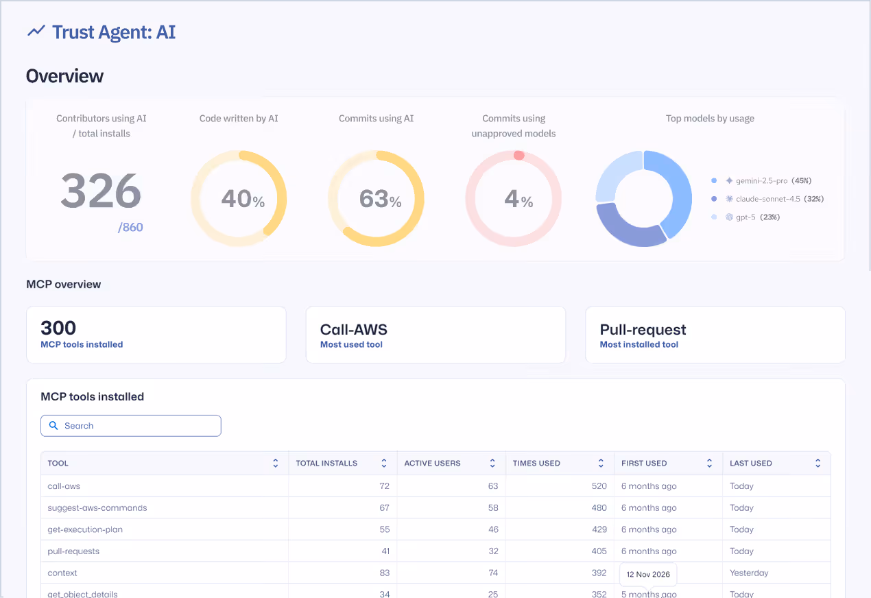 Ermöglichen Sie KI-gestützte Entwicklung unter Beibehaltung der Sicherheitsüberwachung. Verschaffen Sie sich einen Überblick über die KI-Nutzung, wenden Sie Governance-Workflows bei der Festlegung an und passen Sie die Entwicklungspraktiken an die Risikoschwellenwerte des Unternehmens an.